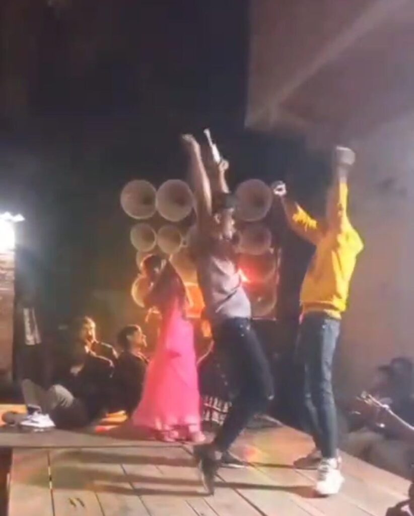 राठ हमीरपुर। सोशल मीडिया में बार बालाओं संग डीजे पर ठुमके लगाते एक युवक का वीडियो वायरल हो रहा है। दबंग युवक नाचते हुए हवा में तमंचे से फायर कर रहा है। ठुमके लगा रहा है, बार बालाएं फायर होते ही कान दबाकर किनारे हो जाती हैं और युवक ठुमके लगाते हुए मंच से नीचे उतर आता है। इसके बाद हरकत में आई पुलिस युवक की तलाश में जुट गई है। आज शनिवार की सुबह से सोशल मीडिया में वायरल हुए 16 सेकंड के वीडियो में बैकग्राउंड में भोजपुरी गीत बज रहा है। तख्त के बने स्टेज पर दो बार-बालाएं ठुमके लगा रही हैं। इन्हीं के संग दो युवक भी नाच रहे हैं। एक युवक हाथ में तमंचा लिए है। इस युवक ने हवा में लहराते हुए तमंचे से फायर झोंक दिया। वायरल वीडियो राठ के गायत्री नगर पठानपुरा का बताया जा रहा है। किसी कार्यक्रम में लगे डीजे में उक्त युवक बार बालाओं संग नाच रहे थे। वीडियो वायरल होते ही पुलिस ने इन दोनों युवकों की शिनाख्त करने के प्रयास शुरू कर दिए हैं।