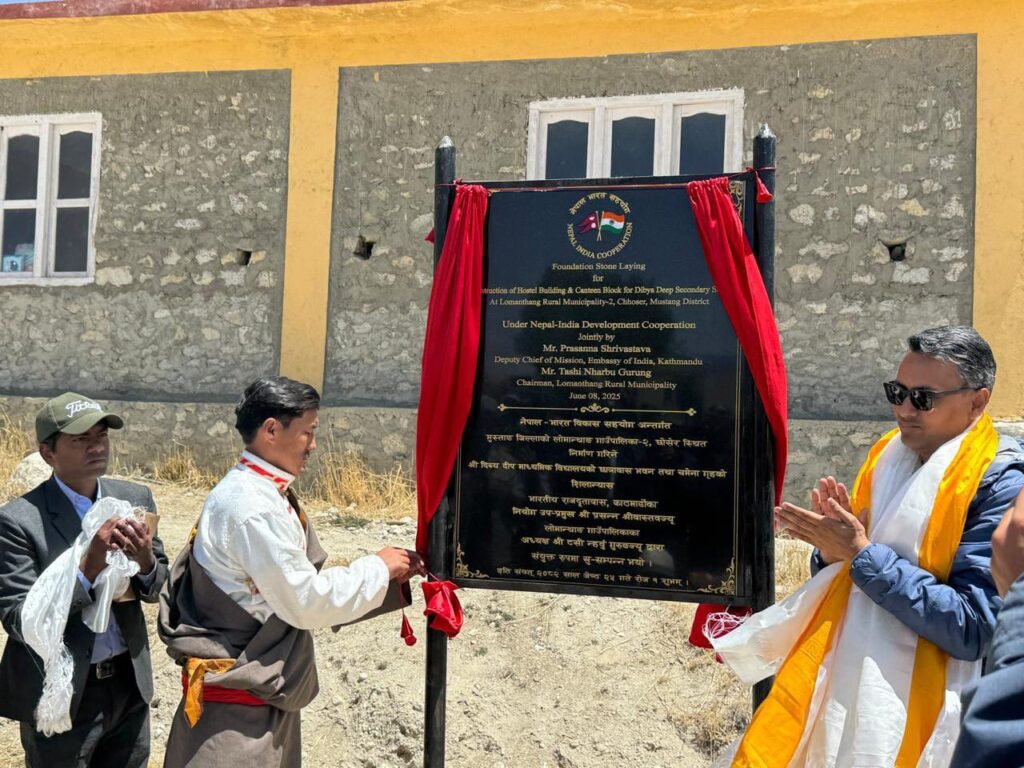 काठमांडू। नेपाल में मस्तंग जिले के लोमंथांग ग्रामीण नगर पालिका में रविवार को श्री दिव्य दीप माध्यमिक विद्यालय में नए छात्रावास भवन और कैंटीन ब्लॉक की आधारशिला रखी गई, जिसका निर्माण भारत की वित्तीय सहायता से किया जा रहा है। भारतीय दूतावास द्वारा जारी एक बयान के अनुसार, काठमांडू स्थित भारतीय दूतावास में मिशन के उप प्रमुख प्रसन्ना श्रीवास्तव और लोमंथांग ग्रामीण नगर पालिका के अध्यक्ष तासी न्हार्बू गुरुंग ने संयुक्त रूप से आधारशिला रखी।
