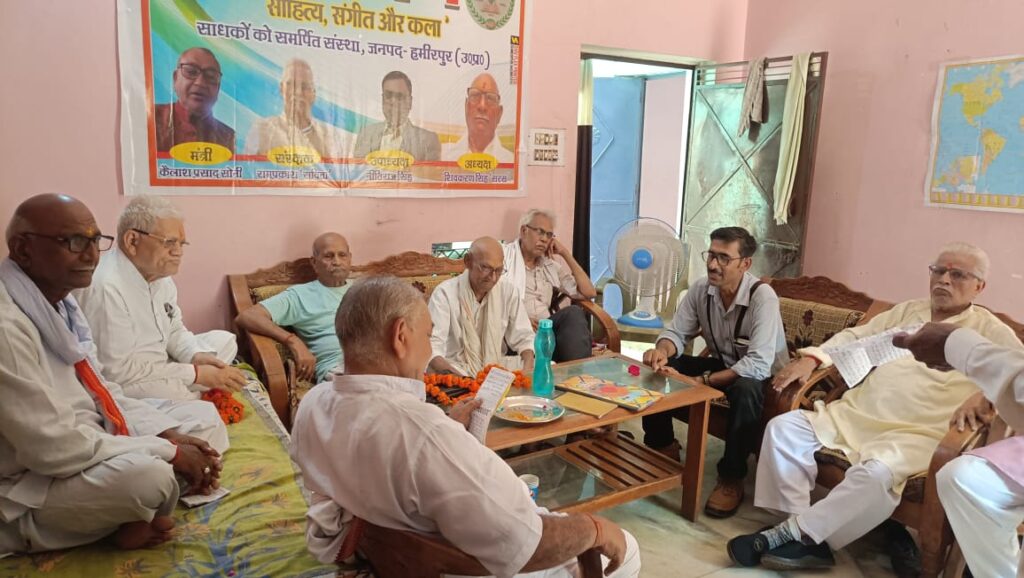 भरुआ सुमेरपुर। कलार्पण भारत संस्था के स्थापना दिवस पर जिलाध्यक्ष शिवकरण सिंह की अध्यक्षता में परनामी आवास पर विचार एवं काव्य गोष्ठी संपन्न हुई। गोष्ठी के मुख्य अतिथि लखनलाल जोशी ललित, विशिष्ट अतिथि कमलेश सिंह गौर एवं चंद्रशेखर अग्निहोत्री रहे। कवि हरीराम गुप्ता निरपेक्ष ने सरस्वती वंदना के पश्चात पढ़ा आप ख्यालों में आना बंद करें,रतजगा अब किया नहीं जाता। लखनलाल जोशी ललित ने पढ़ा तुम दीप शिखा बन जलो कि जितना जलता हुआ दिया है, जिसने अपने बल पर तम से लड़ना सीख लिया है। शिवकरण सिंह सरस ने पढ़ा साहित्य संगीत कला की साधक भारतीयता पहचान बनी, कलार्पण भारत श्रेष्ठ संस्था शत शिव सुंदर हेतु सनी। नारायण प्रसाद रसिक ने पढ़ा हर समस्या का समाधान छिपा होता है, बेईमानों में भी कहीं ईमान छिपा होता है। मुन्नीलाल अवस्थी अजेय ने पढ़ा अभिशापों की धरती पर वरदान उगाने होंगे,जो अंगार विषमता के उन्हें बुझाने होंगे। कमलेश सिंह गौर ने पढ़ा फलक का हुक्म छोड़ो महार के काम, बहार से कहो भरे बसंत के जाम। गणेश सिंह विद्यार्थी ने पढ़ा मन की चाह अधूरी रह गई नीरद लौटे बरसात लिए, कृषक गले फांसी का फंदा सरकार खड़ी खैरात लिए। नीतिराज सिंह ने पढ़ा मोहब्बत वो छोटी कहानी नहीं है, आंखों से बह जाए पानी नहीं है। बीरेंद्र कुमार पाल शजर ने पढ़ा गहरी है बहुत नदिया लहरों में रवानी है, उस पार भी जाना है कश्ती भी पुरानी है। कमल किशोर कमल ने पढ़ा वृक्ष रोपकर धरा बचा लो नहीं उठेगा सलिलद ज्वार, स्वार्थ सिद्धि को रोको टोको कटे वृक्ष कर रहे पुकार। संचालक कैलाश प्रसाद सोनी मृदुल ने पढ़ा कविता कवि की करुण कसक है पीड़ा है अंतर्मन की, विकल वेदना है जीवन के आह भरे विह्वल तन की। शिक्षक वीरेंद्र परनामी ने सभी का आभार व्यक्त किया।