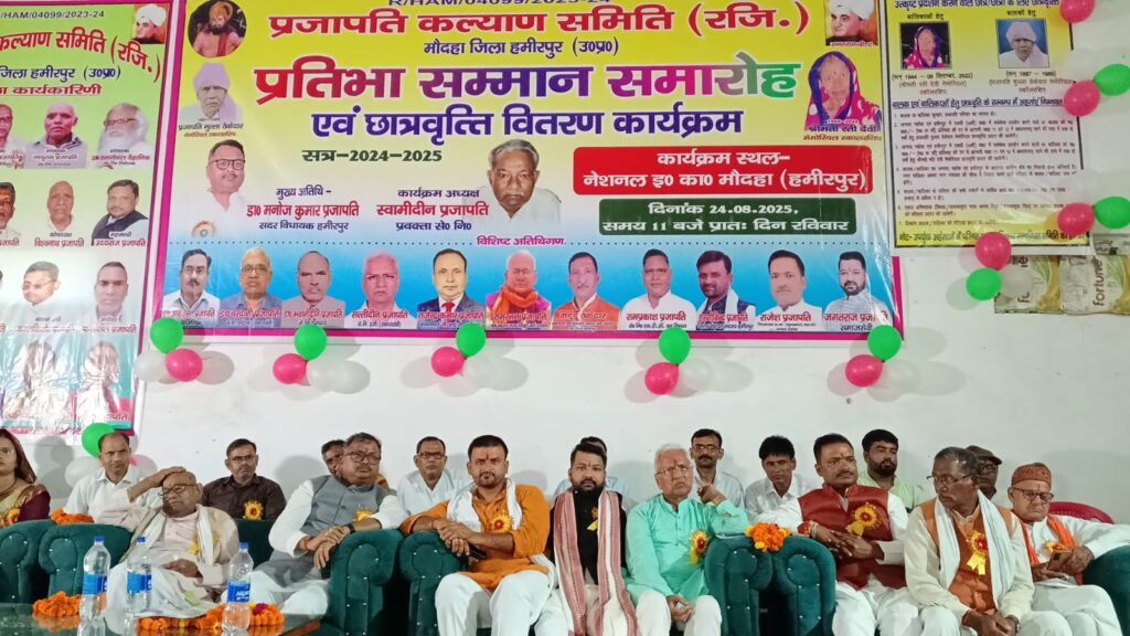 मौदहा के नेशनल इंटर कालेज स्थित गोपाल हाल में आयोजित प्रजापति कल्याण समिति द्वारा आयोजित इस कार्यक्रम में हाईस्कूल और इंटरमीडिएट के 80 मेधावी छात्र छात्राओं को सम्मानित किया गया है। इनमें से चार छात्रों को 600 रुपए प्रति माह लगातार दो वर्षों तक छात्रवृत्ति देने का निर्णय समिति के निर्णायक मंडल द्वारा किया गया। कार्यक्रम के मुख्य अतिथि सदर विधायक डा. मनोज कुमार प्रजापति ने ऐसे आयोजनों को समाज को ऊर्जा और तरक्की प्रदान करने का प्रेरणास्रोत बताया। इस कार्यक्रम में विशिष्ट अतिथि के तौर पर डा. आर एस प्रजापति, डा. बरदानी प्रजापति, डा. बी डी प्रजापति, सत्तीदीन प्रजापति, राजेंद्र प्रजापति, रामरतन प्रजापति, जिला पंचायत सदस्य हरगोविंद प्रजापति, राजेश प्रजापति, गुड्डू ठेकेदार, रामप्रकाश प्रजापति, जगतराज प्रजापति, छोटेलाल प्रजापति, कमलकिशोर, संतोष चक्रवर्ती, उदयराज प्रजापति, डा. पुष्पेन्द्र प्रजापति, रणविजय चक्रवर्ती, लालजी प्रजापति, राजबहादुर दक्ष, रामकृपाल, विश्वनाथ, नारायण, सज्जन, भवानीदीन प्रजापति सहित बड़ी संख्या में सजातीय बंधु उपस्थित रहे।