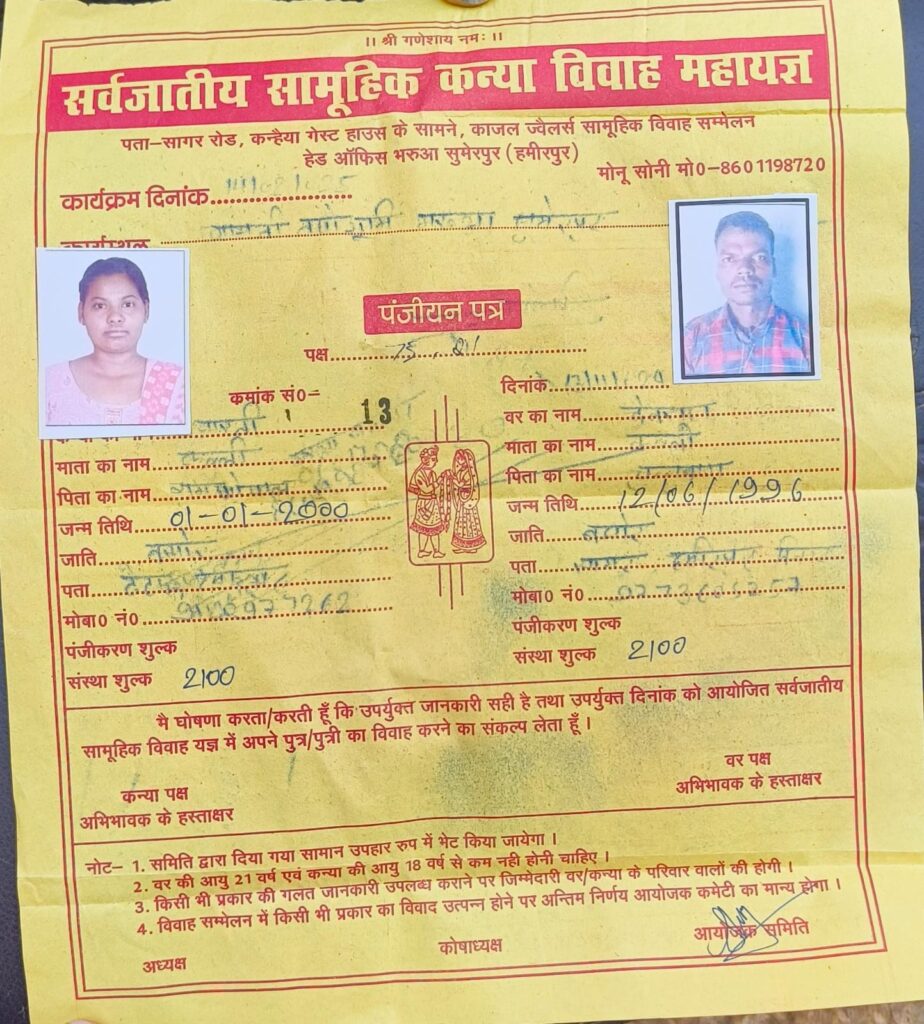 टेढ़ा गांव निवासी रामगोपाल ने बताया कि अपनी पुत्री आरती का विवाह मौदहा क्षेत्र के शायर गांव निवासी देवराज के साथ तय किया था। शादी सामूहिक विवाह सम्मेलन में कस्बे के गायत्री तपोभूमि से 14 अप्रैल को होनी थी। दोनों पक्षों ने सामूहिक विवाह आयोजको को एक लाख 60 हजार रुपए की नगदी मुहैया कराई थी। बताया कि तय समय पर दोनों पक्ष गायत्री तपोभूमि में आ गए थे। लेकिन आयोजन कर्ता गए थे। इससे दोनों पक्ष परेशान रहे। लड़की पक्ष ने बताया कि सामूहिक विवाह का आयोजन गोपाल सोनी की ओर से किया गया है। आयोजन की जो रसीद दी गई है उसमें अहिंसा दल के युवा राष्ट्रीय अध्यक्ष लिखा हुआ है और भाजपा के सहयोगी घटक होने का दावा किया गया। भाजपा के जिला उपाध्यक्ष किशन व्यास ने बताया कि भाजपा का ऐसा कोई संगठन नहीं है।