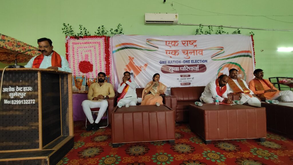 भरूआ सुमेरपुर। एक राष्ट्र-एक चुनाव के निमित्त भाजपा युवा मोर्चा युवा सम्मेलन/युवा परिचर्चा कार्यक्रम सम्पन्न हुआ। कार्यक्रम की अध्यक्षता युवा मोर्चा के जिलाध्यक्ष आकाश त्रिपाठी ने किया। मुख्य अतिथि कानपुर बुंदेलखंड के क्षेत्रीय अध्यक्ष प्रकाश पाल व विशिष्ट अतिथि सुनील पाठक, ब्रजकिशोर गुप्ता, राठ विधायक मनीषा अनुरागी, नरबिंद सिंह ने विचार व्यक्त किया। संचालन युवा मोर्चा के जिला संयोजक राजदीप सिंह ने किया। निवर्तमान जिलाध्यक्ष ब्रजकिशोर गुप्ता ने बताया कि देश के विकास के लिए एक राष्ट्र एक चुनाव बहुत ही आवश्यक है। मुख्य अतिथि प्रकाश पाल ने संबोधित करते हुए उपस्थित सभी नौजवानों में ऊर्जा भरते हुए देश समाज में इस कानून की अत्यंत आवश्यकता है। जिससे देश का आर्थिक विकास होगा एवं देश सुदृढ एवं मजबूत बनेगा। उन्होंने कहा कि हम सब को मिलकर हर एक गांव गली मोहल्ले में इस बात की चर्चा करनी चाहिए कि एक राष्ट्र-एक चुनाव देश को प्रगति के शिखर पर पहुँचेगा। मीडिया प्रभारी अरविंद श्रीवास्तव ने बताया कि विधानसभा में विगत दिनों युवा संसद कार्यक्रम के प्रतिभागियों को भी मंच से संबोधित करने का अवसर दिया गया और उनको सम्मानित किया गया। प्रतिभागियों में कु.सुहानी धुरिया, कु.शिखा चौहान,सूरज कुमार,कु.मनु शिवहरे,कु.काजल रहे। जिलाध्यक्ष आकाश त्रिपाठी ने सभी का आभार प्रकट किया। इस अवसर पर आशीष पालीवाल,किशन व्यास, लालाराम निषाद,सुरेंद्र तिवारी, रामदेव सिंह, विशेष नायक,शकुंतला निषाद,रणवीर सिंह,अनूप सिंह,जगतराज प्रजापति,पुष्पराज सोनी,साधना सिंह,सुधेश द्विवेदी,जितेंद्र पाल, राजीव आर्य,निशांत त्रिपाठी, शिवम द्विवेदी,सौरभ सिंह,अजीत सिंह,मोहित सोनी,आदर्श सिंह,अभय यादव,दीपक सिंह गौर,मोहित साहू,संचित पांडेय सहित अन्य लोग उपस्थित रहे।