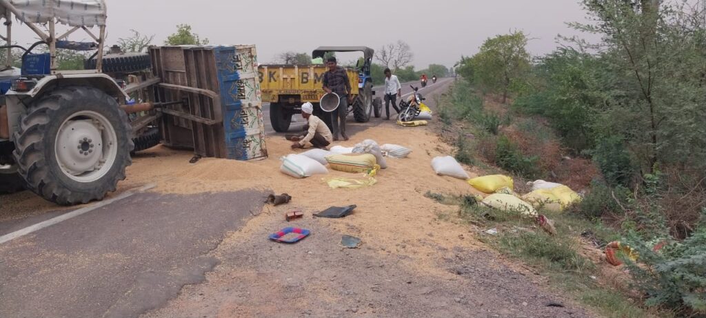 हमीरपुर। अपने गांव से गेहूं लादकर मौदहा आ रहे ट्रैक्टर में राजमार्ग पर पीछे से आ रहे बेकाबू डंपर ने टक्कर मार दी। जिससे ट्राली पलटने से उसमें बैठे एक सेवानिवृत लेखपाल सहित तीन किसान गंभीर रूप से घायल हो गए और ट्राली पर लदा गेहूं सड़क किनारे फैल गया। सभी घायलों को लहूलुहान हालत में सरकारी अस्पताल लाया गया। जहां तीनों का प्राथमिक उपचार कर मुख्यालय रेफर कर दिया गया।